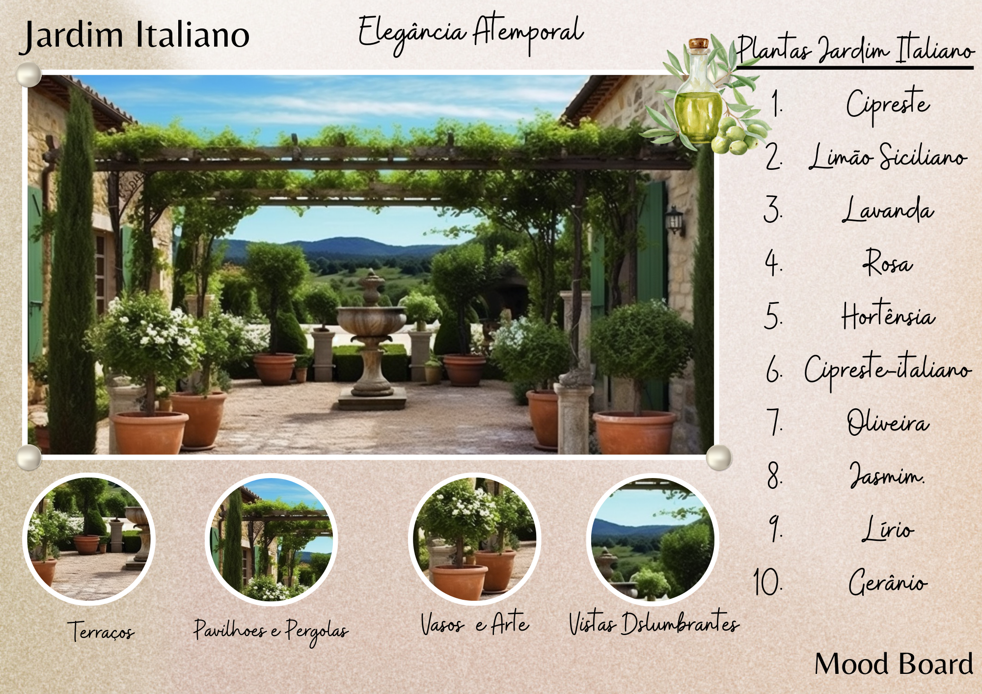 Estas são apenas algumas das plantas mais comuns encontradas nos jardins italianos. A escolha das plantas pode variar dependendo das preferências do paisagista e das condições específicas do local, mas essas espécies são frequentemente utilizadas para criar a atmosfera desejada em cada estilo de jardim.
